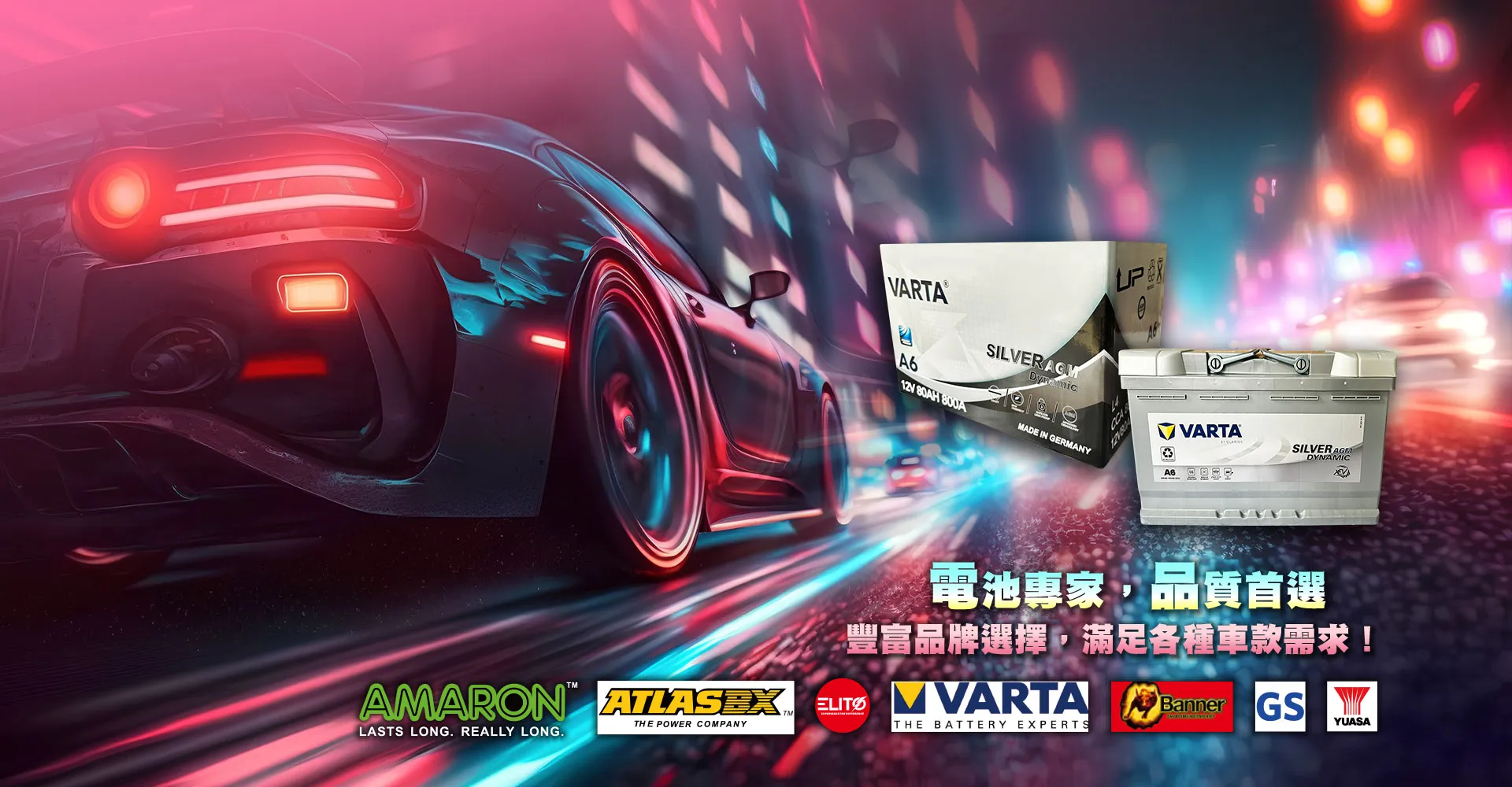 品牌齊全:我們代理多款市面知名電池品牌,包括 ATLASBX、AMARON 愛馬龍、ELITO 愛力龍、GS 統力、YUASA 湯淺、SCB、Long 廣隆、VARTA、BANNER 紅牛電池 等, 並供應 AGM 電瓶、UPS 專用電池、深循環電池,涵蓋從日常通勤車、進口車系至商用車及備援電力系統,皆可對應。